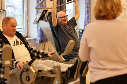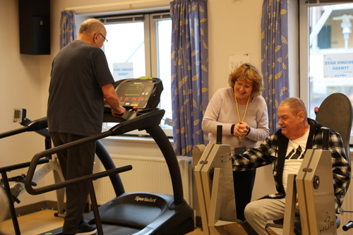 ”Hver deltager har sit eget træningskort med piktogrammer af maskinerne. Her noterer de belastning, antal sæt og gentagelser, så de kan følge deres udvikling. Træningen begynder med opvarmning på kondicykel, romaskine eller løbebånd – og derefter går de i gang ved maskinerne,” fortæller Lotte.